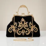 تتميز هذه الحقيبة بتصميم مخملي أسود عميق، مزين بتطريز ذهبي فاخر مستوحى من الزخارف الملكية، مع لمسات ملونة دقيقة تضيف بعدًا فنيًا راقيًا.