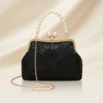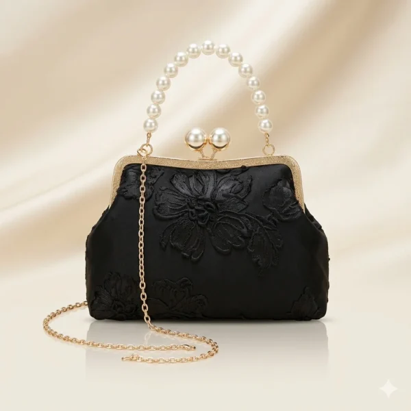 الإطار المعدني الذهبي يمنحها طابعًا كلاسيكيًا أنيقًا، بينما يضيف مقبض اللؤلؤ لمسة أنثوية راقية تجعلها قطعة مثالية للسهرات والمناسبات الخاصة.