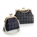 يتكون من حقيبتين متناسقتين (كبيرة + صغيرة)، مع إطار معدني أنيق ومقبض مزين باللؤلؤ يمنح القطعة طابعًا أنثويًا راقيًا.