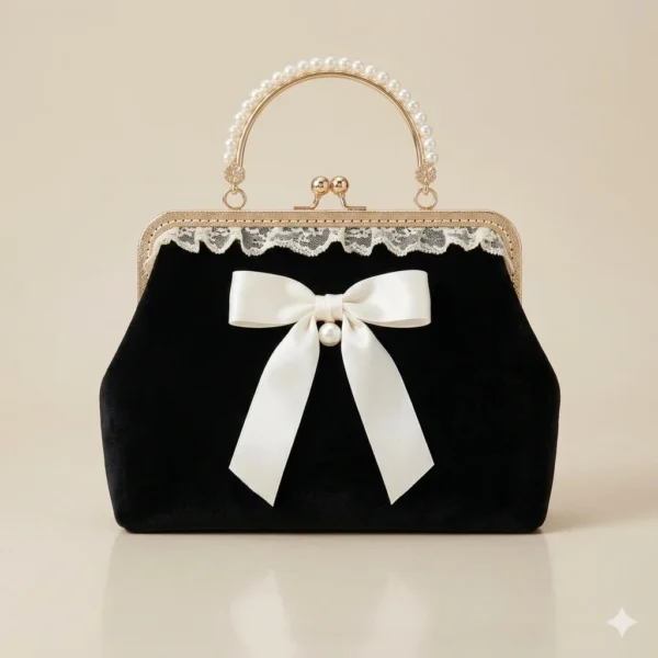 مصنوعة من قماش مخملي أنيق، ومزينة بفيونكة ساتان جذابة مع لمسة لؤلؤية في المنتصف، إضافة إلى حافة دانتيل ناعمة تضيف لمسة أنثوية رقيقة. المقبض المعدني المزخرف باللؤلؤ يكمل التصميم ليمنحك قطعة فاخرة من كل زاوية.