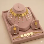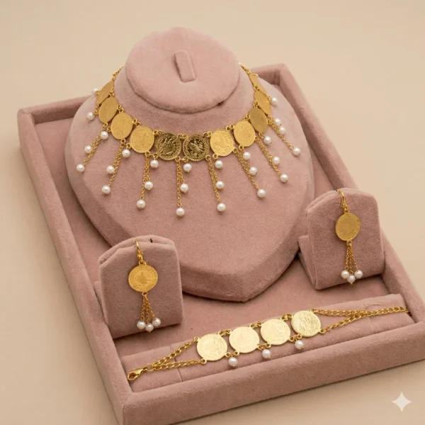 يتكوّن من عقد مزين بقطع دائرية ذهبية مع سلاسل متدلية مزخرفة بحبات اللؤلؤ، بالإضافة إلى أقراط وسوار متناسقين يكملان الإطلالة بأسلوب متكامل وجذاب.