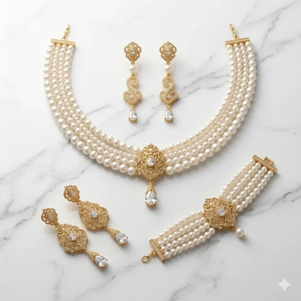 يتكوّن من عقد متعدد الطبقات من اللؤلؤ مع قطعة مركزية مزخرفة بتفاصيل دقيقة، بالإضافة إلى أقراط أنيقة وسوار متناسق يكمل الإطلالة بأسلوب ملكي. تصميم يعكس الرقي الكلاسيكي ويضيف لمسة فخمة لأي إطلالة عروس أو سهرة.