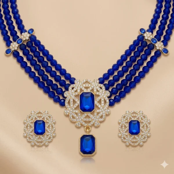 يتكوّن من عقد متعدد الطبقات مزين بأحجار كريستالية زرقاء مع قطعة مركزية فاخرة محاطة بتفاصيل دقيقة، بالإضافة إلى أقراط متناسقة تكمل الإطلالة بأناقة متكاملة.