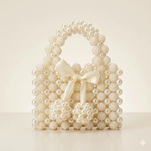 تجمع بين تصميم أنيق ومميز مع فيونكة ساتان تضيف لمسة رومانسية جذابة، بالإضافة إلى تفاصيل لؤلؤية ثلاثية الأبعاد تمنح الحقيبة طابعًا فريدًا لا يشبه أي تصميم تقليدي. المقبض المصنوع من اللؤلؤ يكمل هذا التناغم ليمنحك قطعة متكاملة من حيث الجمال والتفاصيل.