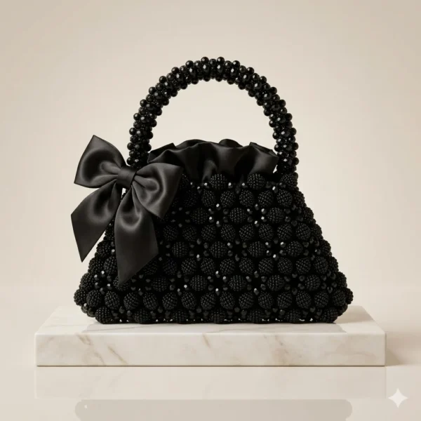 هذه الحقيبة السوداء الفاخرة مصممة لتجسّد الرقي الكلاسيكي بأسلوب أنثوي ناعم، حيث تمت تغطيتها بالكامل بحبات الخرز الدقيقة التي تضيف عمقًا ولمعانًا راقيًا.