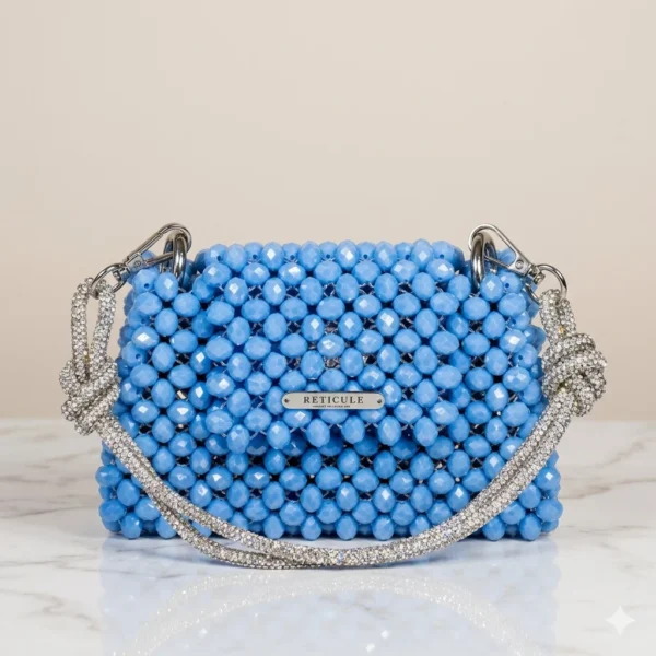 تأتي هذه الحقيبة بتصميم عصري جريء مغطى بالكامل بحبات الخرز اللامعة باللون الأزرق الحيوي، لتمنحك حضورًا مميزًا ومختلفًا عن المعتاد.