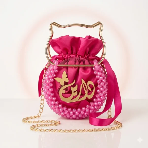تأتي الحقيبة مزينة بإطار من الخرز اللامع الذي يضيف لمسة فخمة ومبهجة، مع اسم مخصص باللون الذهبي ليجعل كل قطعة فريدة من نوعها. المقبض المعدني بتصميم مميز يمنح الحقيبة طابعًا عصريًا مختلفًا، بينما توفر السلسلة الذهبية وربطة الساتان إمكانية حملها بأكثر من طريقة.